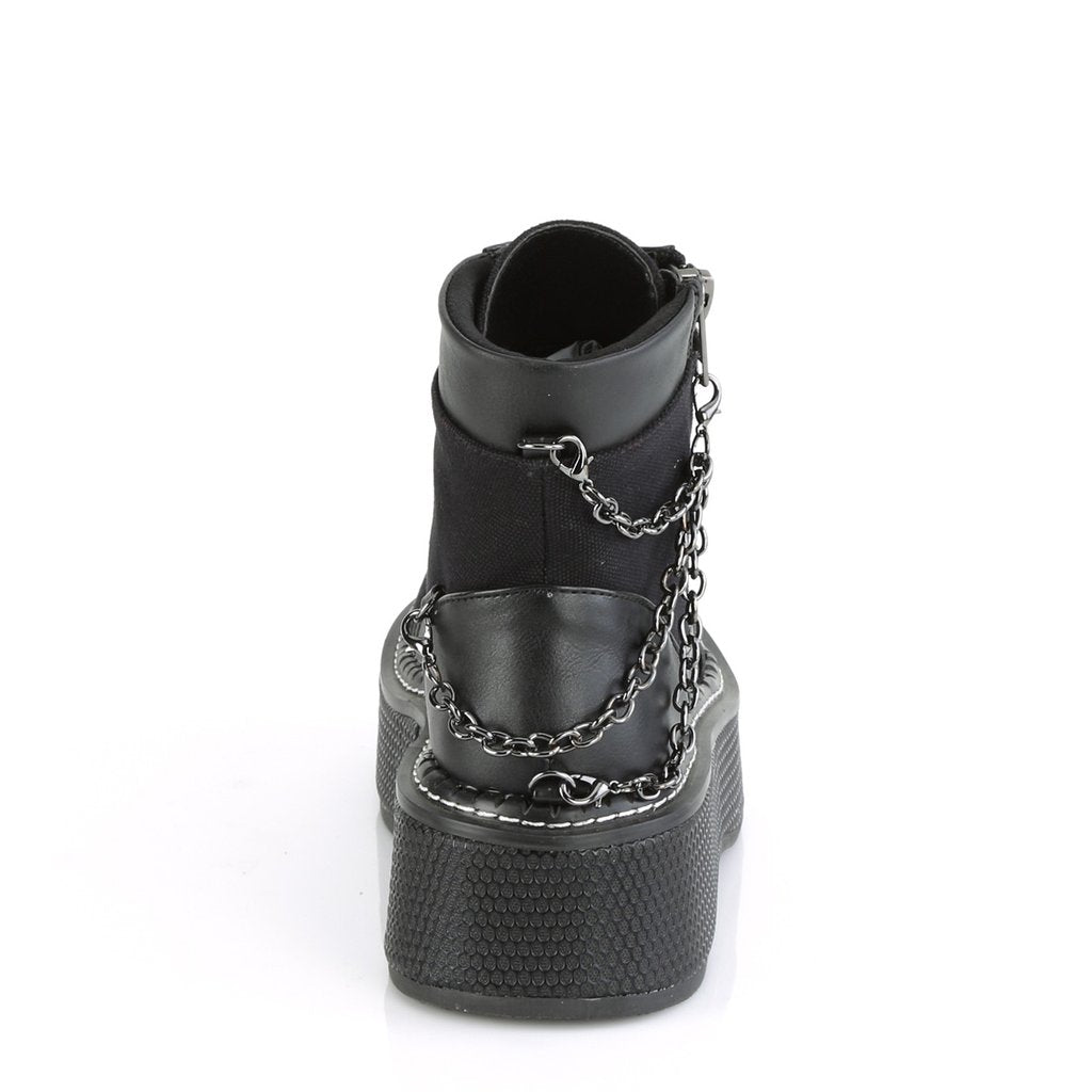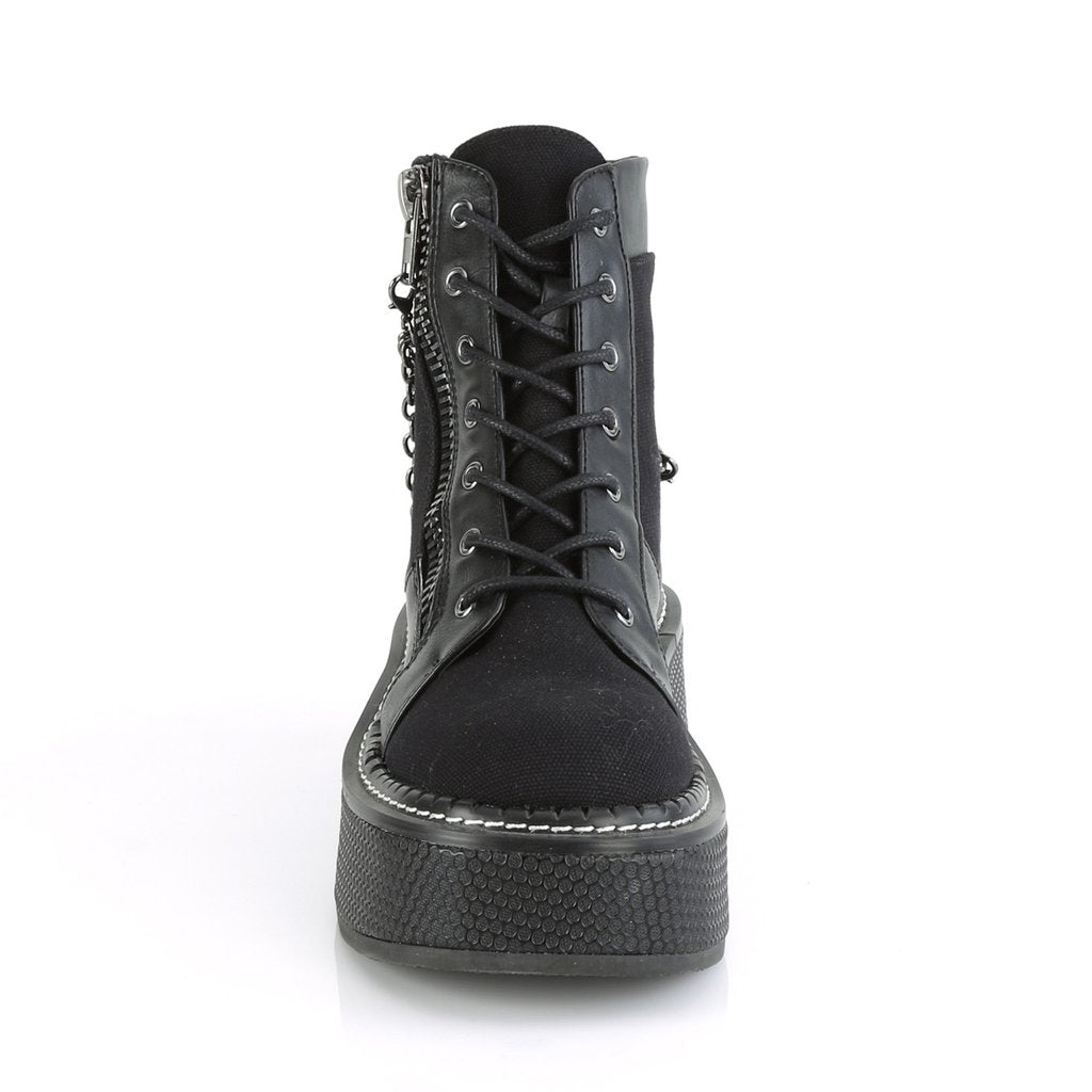 Black canvas platform lace-up front bootie with padded ankle collar, outer metal zipper and removable chain.