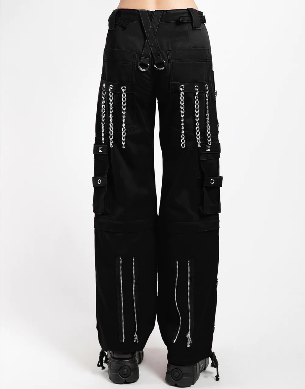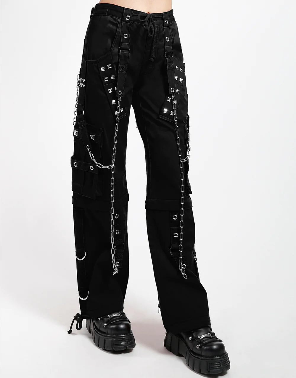 Black classic Tripp pants that zip off into shorts. Pants have detachable chains, adjustable ankle strings to adjust fit, D-ring details, stud details and deep pockets.